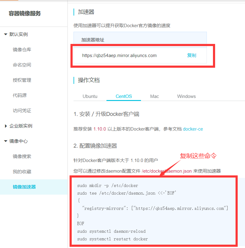 设置阿里云镜像加速器,复制代码到系统内运行即可: