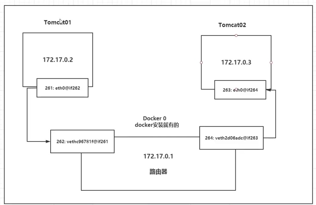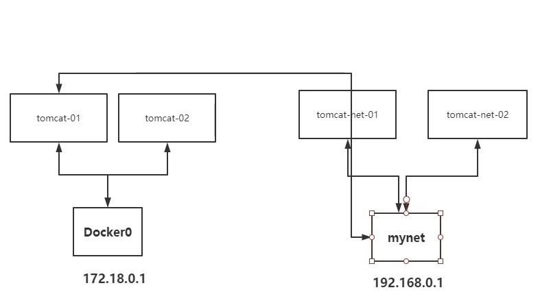 现在已经有默认网络docker0和自定义网络mynet,现在如何实现两个网络下的容器相互访问;docker0下有容器tomcat-test,mynet下有容器tomcat01和tomcat02;连通指定网络和容器名即可实现网络连通