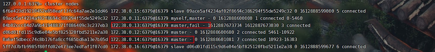 redis-cli --cluster create 172.38.0.11:6379 172.38.0.12:6379 172.38.0.13:6379 172.38.0.14:6379 172.38.0.15:6379 172.38.0.16:6379 --cluster-replicas 1